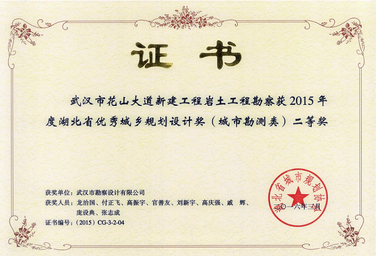 花山大道新建工程巖土工程勘察獲2015年度湖北省優(yōu)秀城鄉(xiāng)規(guī)劃設計