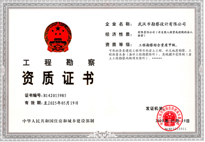 2020年5月19日,我司工程勘察綜合資質(zhì)甲級(jí)延期申報(bào)材料順利通過國(guó)家住房和城鄉(xiāng)建設(shè)部的最終審核,獲準(zhǔn)延期,取得了國(guó)家住建部頒發(fā)的工程勘察綜合資質(zhì)甲級(jí)新證,為我司今后能夠順利承接各類建設(shè)工程項(xiàng)目的巖土工程、水文地質(zhì)勘察、工程測(cè)量業(yè)務(wù)等提供了有力的保障。
