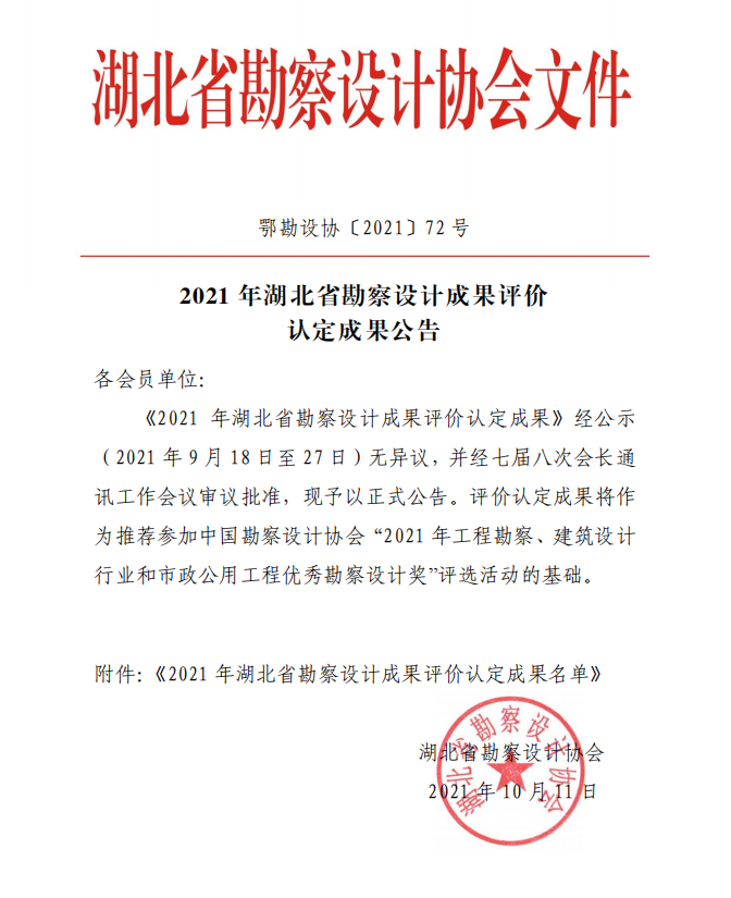 10月11日,湖北省勘察設(shè)計(jì)協(xié)會(huì)正式發(fā)布《2021年湖北省勘察設(shè)計(jì)成果評(píng)價(jià)認(rèn)定成果公告》,公司實(shí)施的5個(gè)項(xiàng)目分別榮獲工程勘察組一二三等獎(jiǎng)。