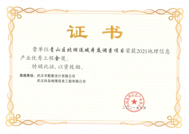 “武漢市中心城區(qū)排水管網(wǎng)隱患排查項(xiàng)目”及“青山區(qū)北湖流域本底調(diào)查項(xiàng)目”喜獲中國(guó)地理信息產(chǎn)業(yè)協(xié)會(huì)優(yōu)秀工程金獎(jiǎng)