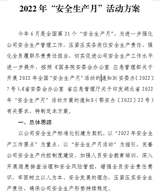 5月31日,公司研究制定了《2022年“安全生產(chǎn)月”活動(dòng)方案》,成立了“安全生產(chǎn)月”活動(dòng)領(lǐng)導(dǎo)小組,并以活動(dòng)領(lǐng)導(dǎo)小組為核心,全面部署開展安全生產(chǎn)月專項(xiàng)活動(dòng),積極動(dòng)員公司全員參與,充分彰顯了領(lǐng)導(dǎo)帶頭抓安全、人人講安全的良好風(fēng)貌。
