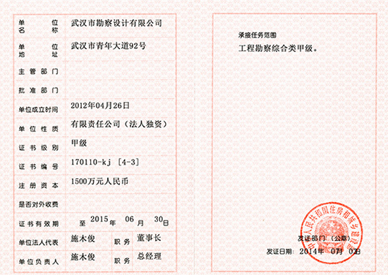在我院領(lǐng)導(dǎo)的指導(dǎo)關(guān)心下,經(jīng)過管理部門長久以來的大力支持以及全院相關(guān)人員的協(xié)作和努力,7月3日,我院勘察公司喜獲國家住建部頒發(fā)的工程勘察綜合類甲級資質(zhì)證書。