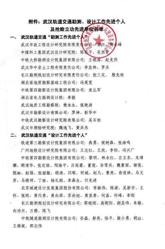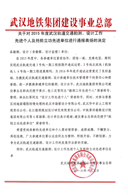 鑒于我公司在武漢市軌道交通3號(hào)線香惠區(qū)間地面塌陷搶險(xiǎn)工作中的突出表現(xiàn),武漢地鐵集團(tuán)有限公司建設(shè)事業(yè)總部授予我公司等6家勘察、設(shè)計(jì)單位“搶險(xiǎn)立功先進(jìn)單位”榮譽(yù)稱號(hào)。其中我公司在各單位中排在第一位。為激發(fā)武漢交通勘測(cè)、設(shè)計(jì)單位技術(shù)管理骨干的責(zé)任心和榮譽(yù)感,授予我公司羅坤、彭華中2位同志武漢軌道交通“勘測(cè)先進(jìn)個(gè)人”。(巖土一公司)