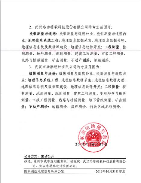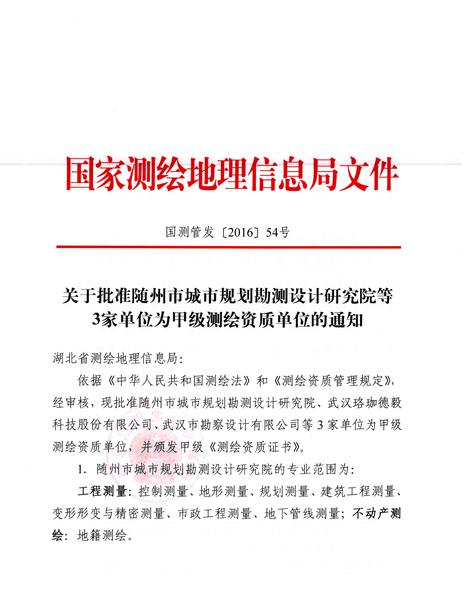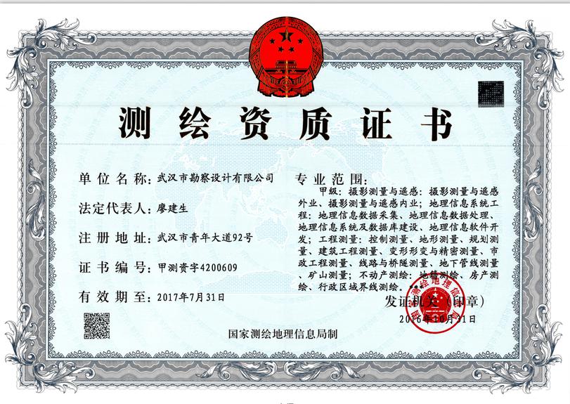 日前,經(jīng)湖北省測繪地理信息局審查推薦、國家測繪地理信息局審核批準(zhǔn),武漢市勘察設(shè)計(jì)有限公司榮獲甲級(jí)測繪資質(zhì)證書。自此我公司甲級(jí)測繪業(yè)務(wù)將全面覆蓋攝影測量與遙感、地理信息系統(tǒng)工程、工程測量、不動(dòng)產(chǎn)測繪等專業(yè)范圍。