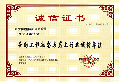 在公司領(lǐng)導(dǎo)和各部門的大力支持下,經(jīng)過公司生產(chǎn)經(jīng)營(yíng)部精心的組織和認(rèn)真準(zhǔn)備,我公司順利通過中國(guó)勘察設(shè)計(jì)協(xié)會(huì)的復(fù)審,順利成為湖北省首批獲得“全國(guó)工程與巖土行業(yè)誠(chéng)信單位”的企業(yè)。