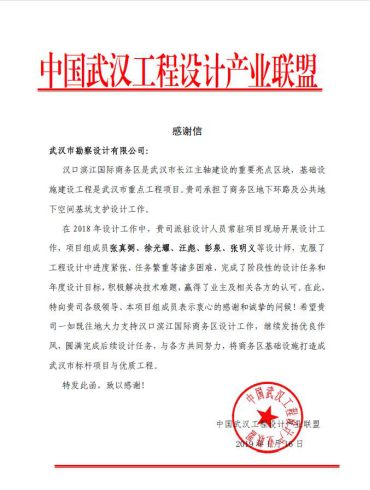 2019年1月21日,中國武漢設(shè)計(jì)產(chǎn)業(yè)聯(lián)盟向我司發(fā)來感謝信,對(duì)漢口濱江國際商務(wù)區(qū)基坑支護(hù)設(shè)計(jì)項(xiàng)目組成員一年來辛勤而卓有成效的工作表示感謝,這封感謝信代表了設(shè)計(jì)產(chǎn)業(yè)聯(lián)盟對(duì)我司設(shè)計(jì)工作的充分認(rèn)可。