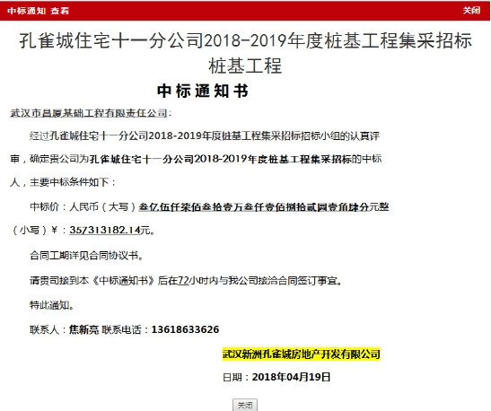 2018年4月19日,我司經(jīng)過多輪競(jìng)爭(zhēng)報(bào)價(jià),成功中標(biāo)孔雀城住宅十一分公司2018-2019年度樁基工程集采招標(biāo)樁基工程,中標(biāo)價(jià)為3.57億元。 與武漢新洲孔雀城房地產(chǎn)開發(fā)有限公司合作,是我公司繼保利地產(chǎn)(集團(tuán))股份有限公司、萬科房地產(chǎn)(集團(tuán))股份有限公司、金地...