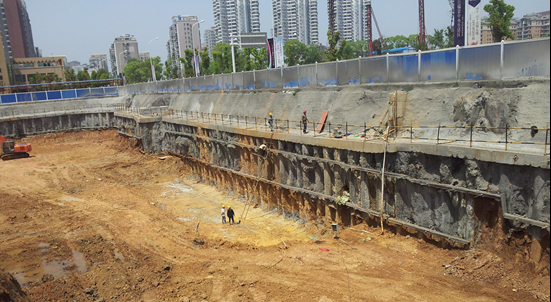 工程特點:項目位于武昌區(qū)武珞路老武鍋內(nèi),設置二層滿鋪地下室,開挖深度9.70m~15.50m,周長380m,面積8500m2。
